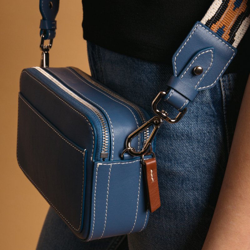 A new timeless bag from the House, this camera bag is carefully crafted in nappa calfskin leather in a deep, luminous blue. Elegant details give it its unique signature: a careful play of cream stitching, a leather shoulder strap with finely worked trimmings, and a discreet wooden signature plate.