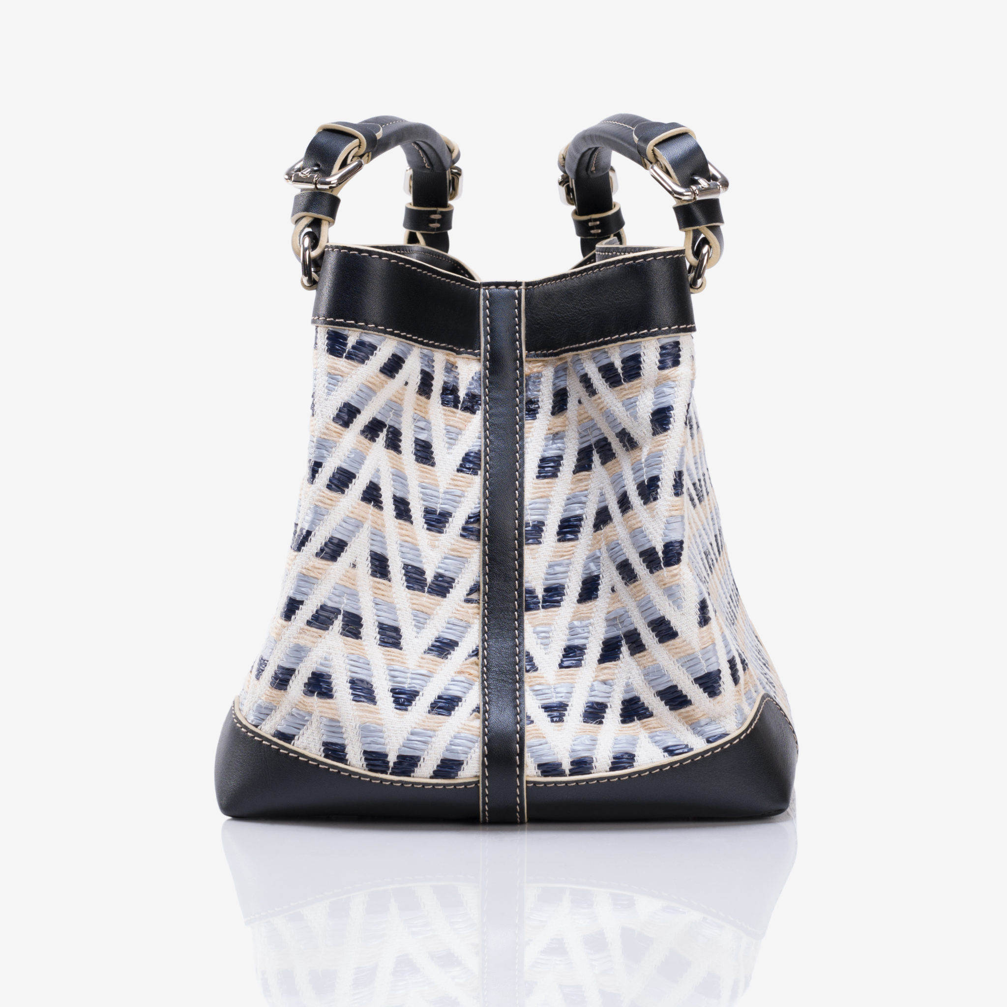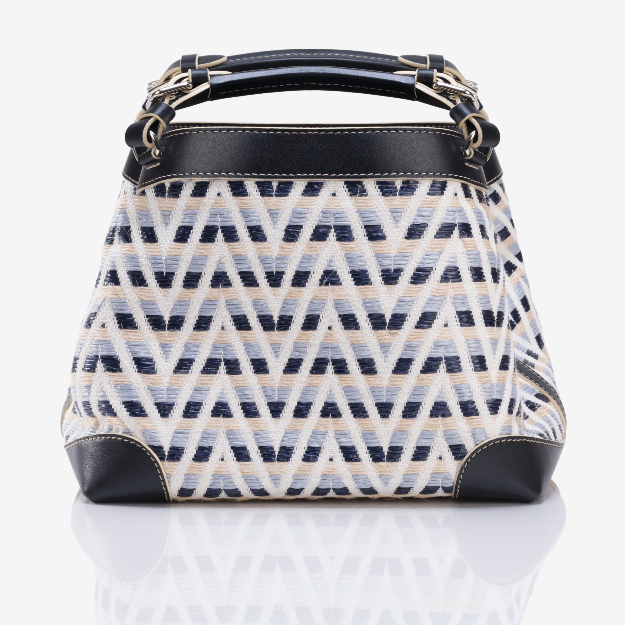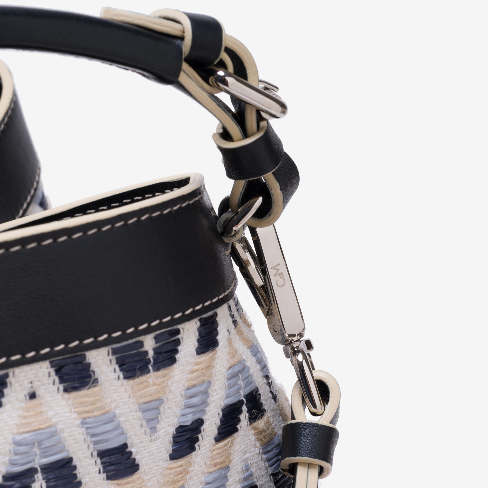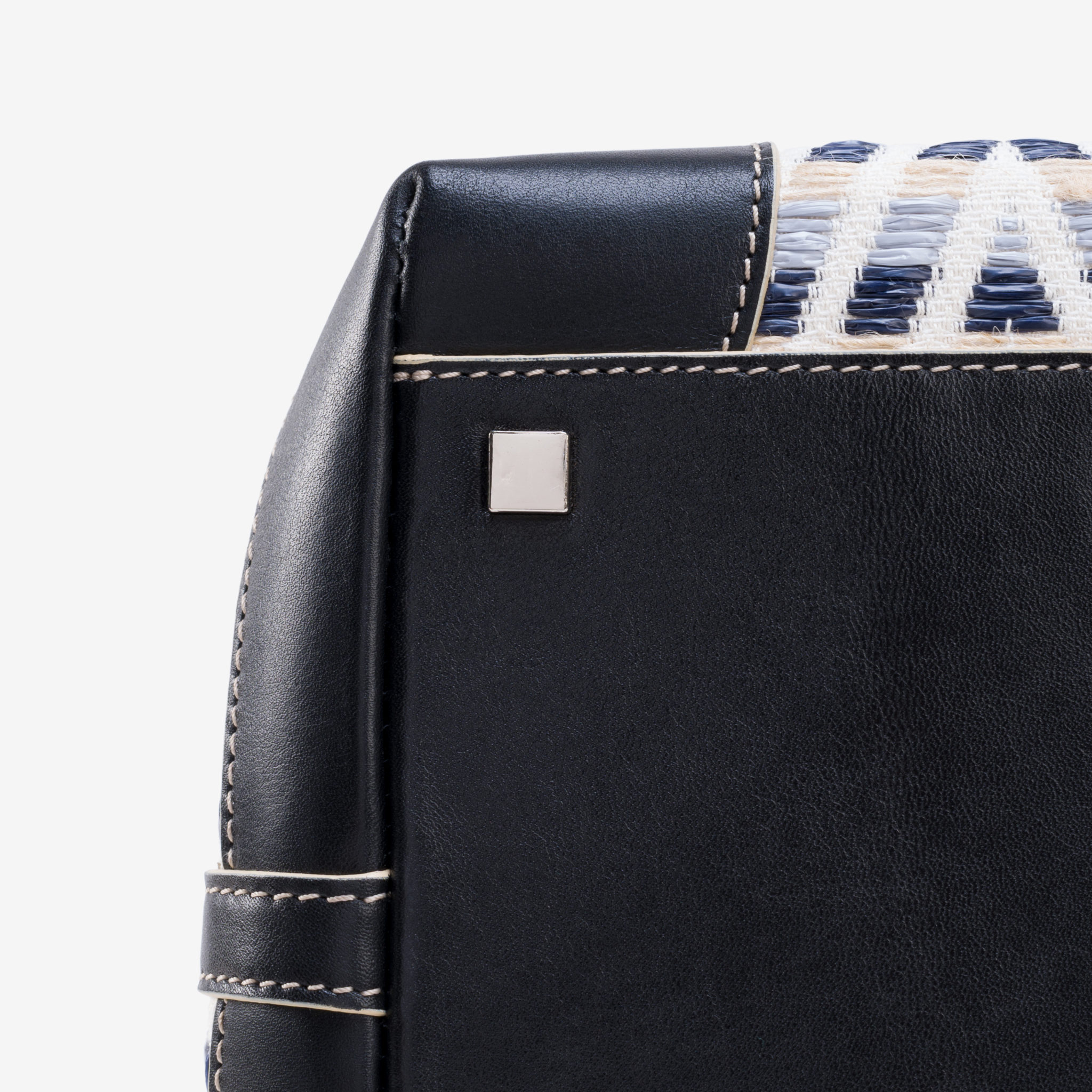 Made of woven raffia with a geometric pattern and black leather, the Cubo Africa bag is a summer wardrobe essential.