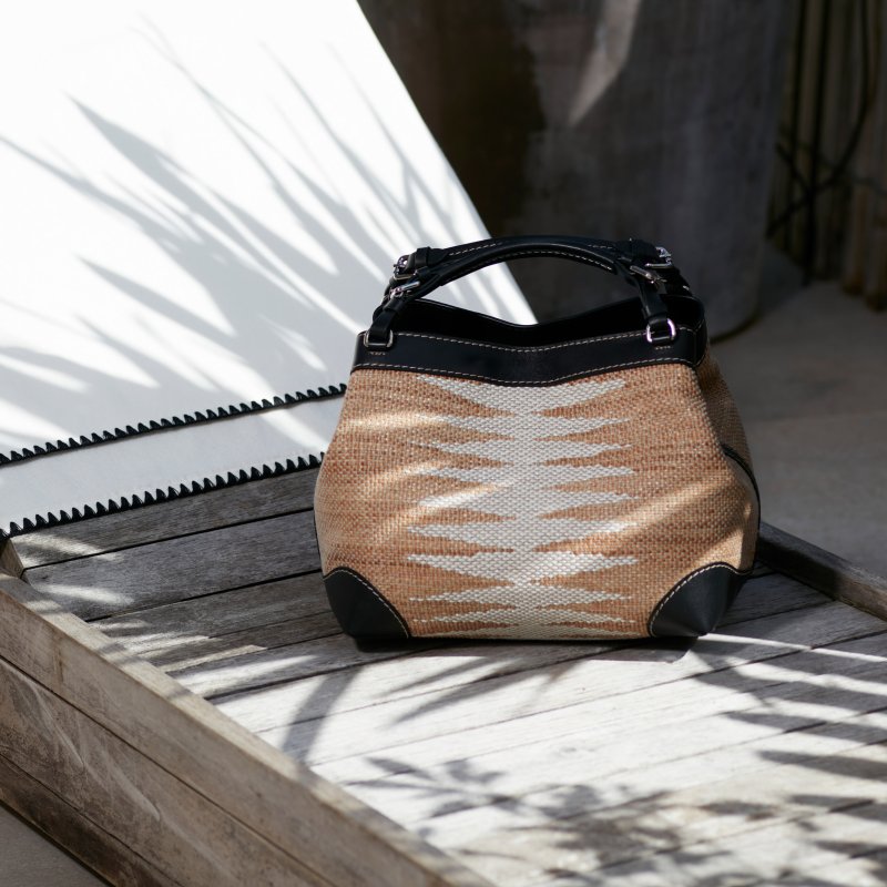 Available in natural and wild colors, the Cuba Gaïa is dressed in a sand-colored woven raffia, sublimated by a smooth ebony nappa calf leather. Designed to hold all your daily essentials, this large format is enhanced by a woven graphic pattern.