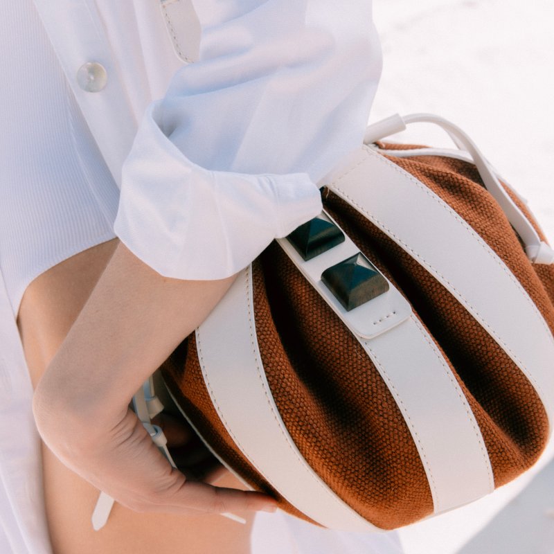 This ball bag is made of a mix of white nappa calfskin leather and brown cotton canvas and has a harmonious and refined silhouette. Its ebony details, colored trimmings and leather lining give it a refined finish.