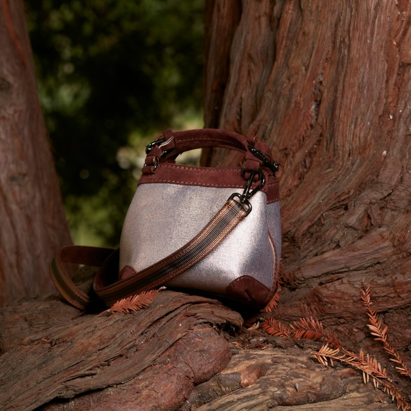 Caroline De Marchi offers a brand-new version of her flagship mini-size model: a coppery denim inspired by the soft glow of dusk, punctuated by brown suede calfskin details. This distinctive party-bag can be worn with its matching passementerie shoulder strap, or as a mix-and-match bag for a more casual look.