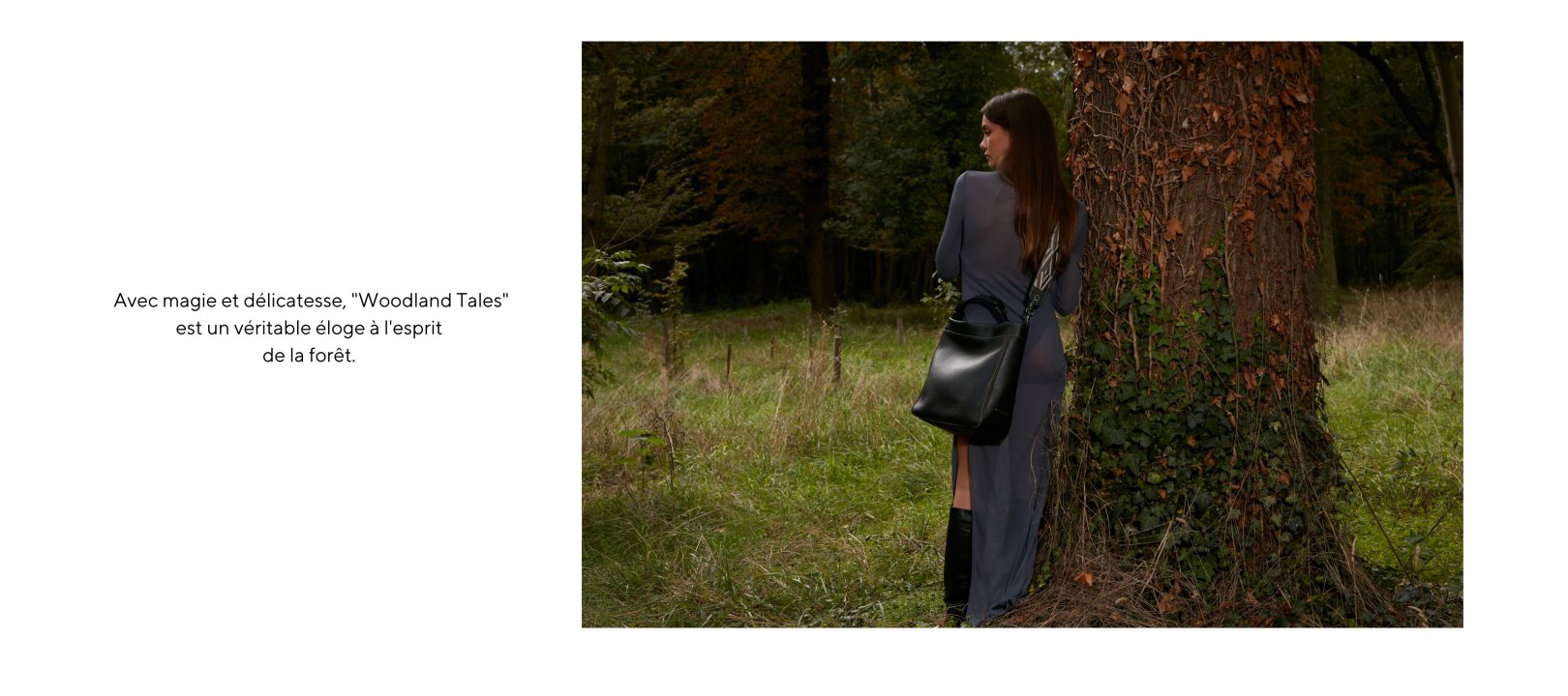 Entre cuirs nobles mats ou mordorés, l’alchimie opère. Avec magie et délicatesse, "Woodland Tales" est un véritable éloge à l'esprit de la forêt. Essences de bois, écorces, racines, jeux de branches entremêlées, feuillages, roche, cascade... L'art du métissage, véritable signature de la créatrice, se décline dans une palette chromatique boisée sublimée de finitions iconiques : intérieurs ultra travaillés, surpiqûres affirmées, poignées franches, détails de bois viennent parfaire chaque sac avec subtilité.