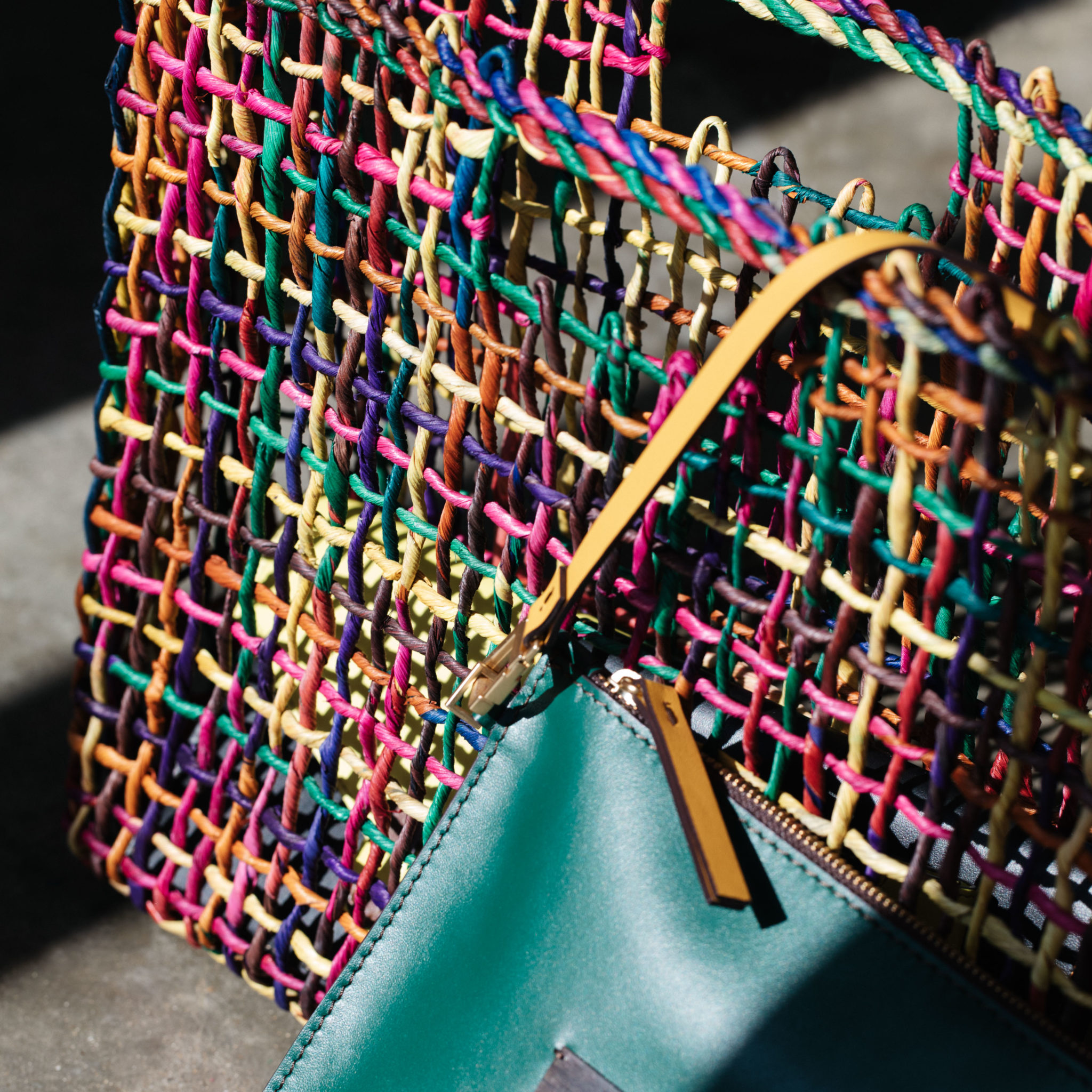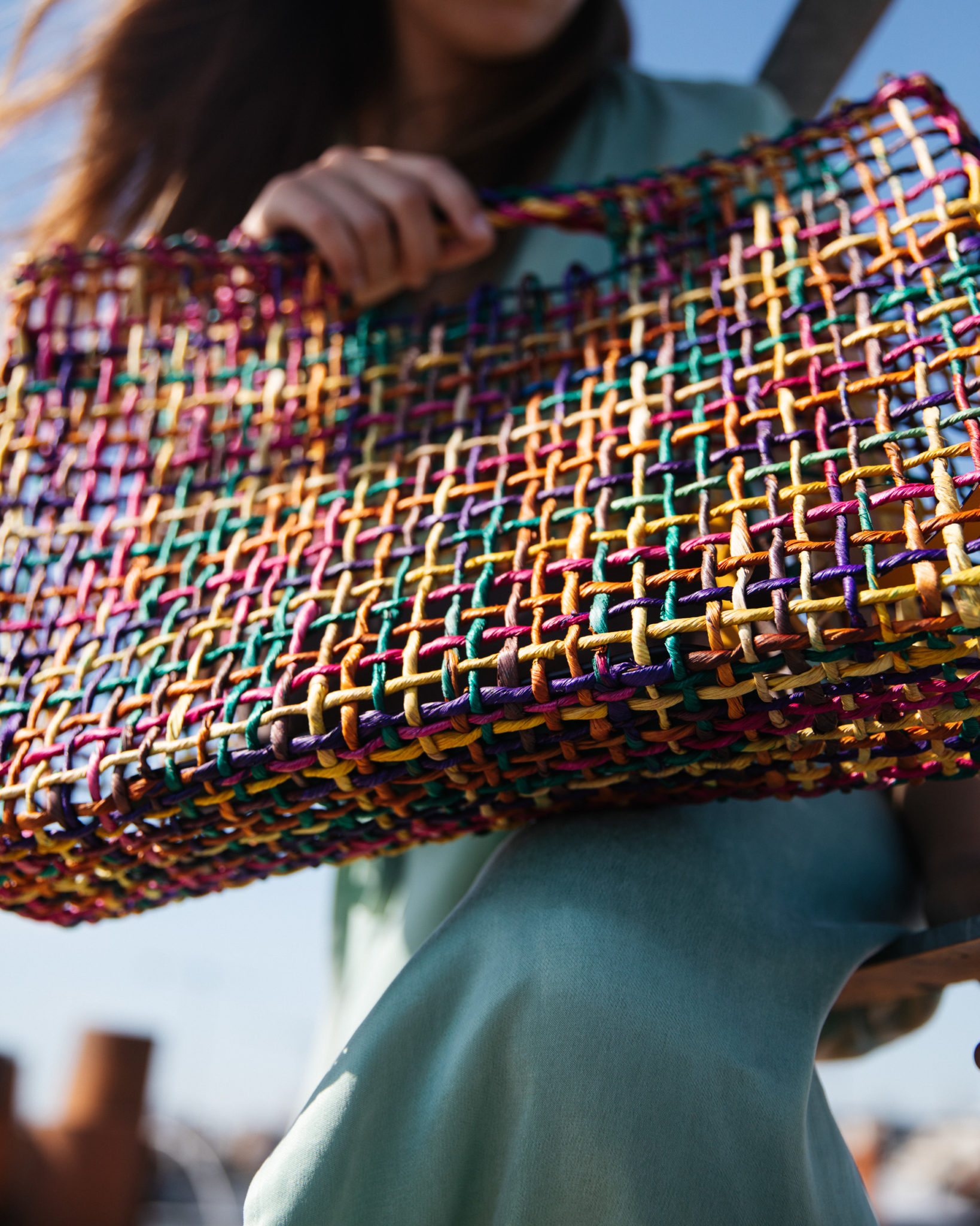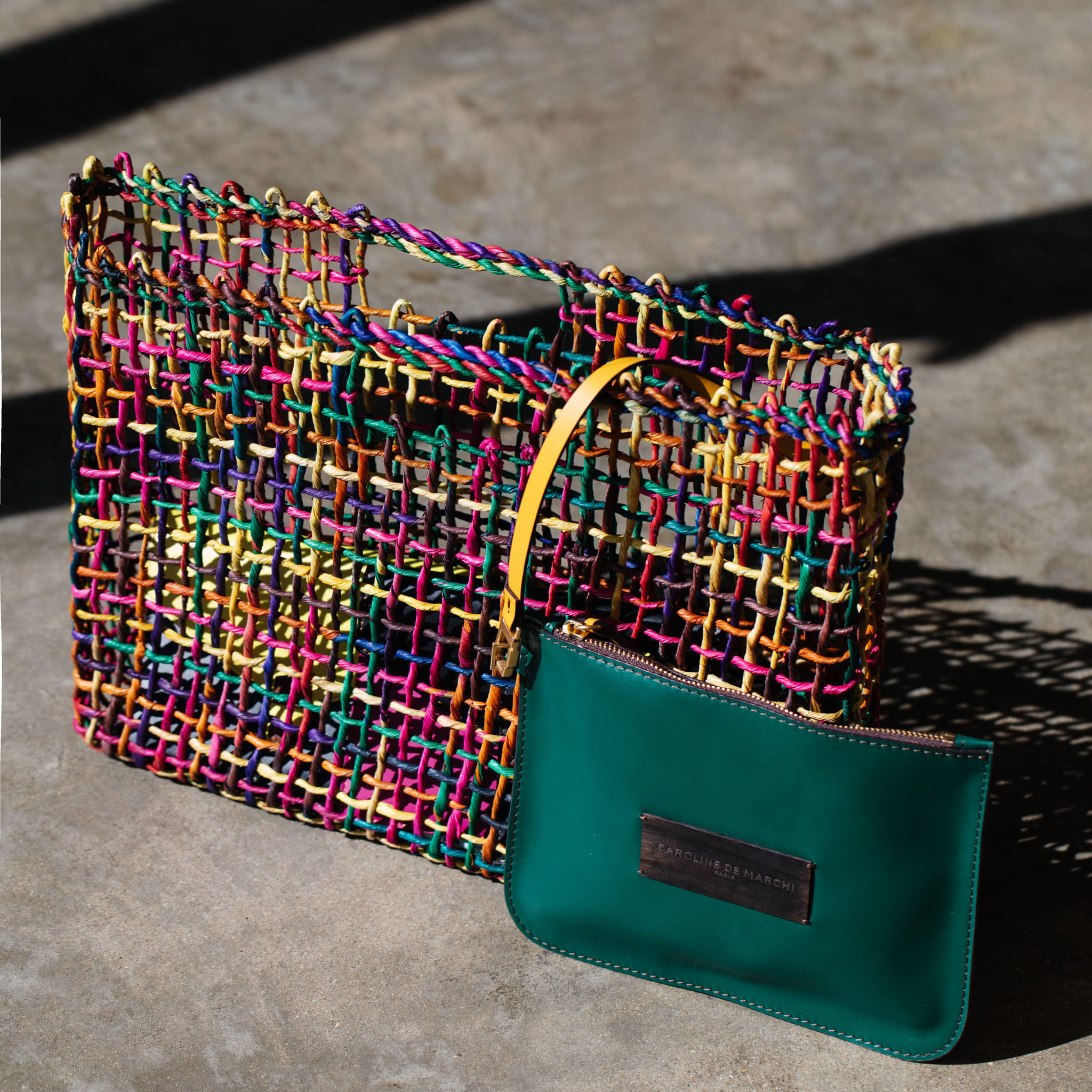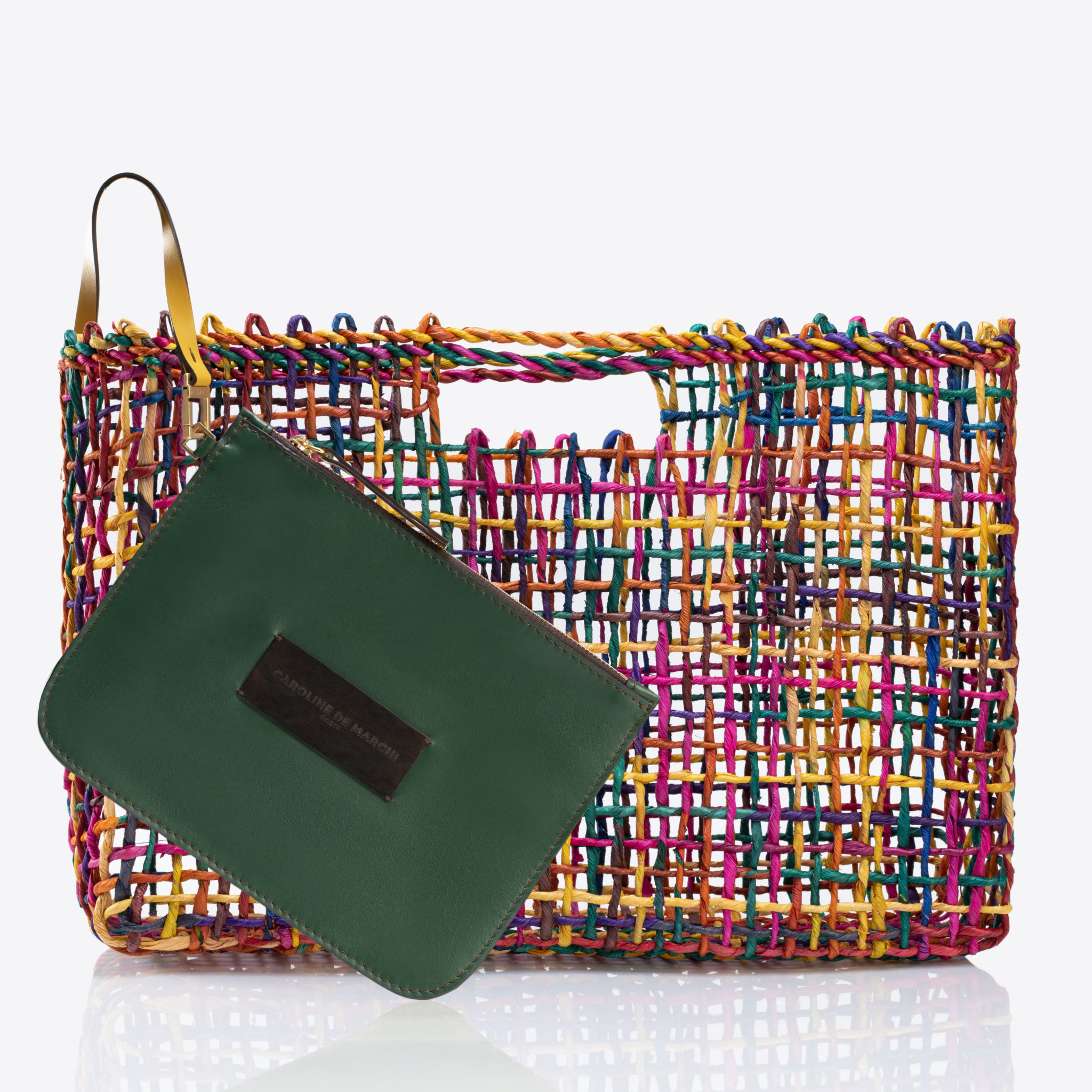 Réalisés au Brésil dans la région de Bahia, près de Feira de Santana, nos paniers sont tressés à la main par des femmes réunies en communauté. Travaillant à la maison, elles tissent la fibre de maïs avec passion pour donner vie à ces modèles fidèles à l’esprit du carnaval. Un savoir faire qu’elles se transmettent de mère en fille depuis des générations, auquel Caroline souhaite rendre hommage. Confectionnée dans nos ateliers italiens, sa pochette en cuir multicolore amovible est un symbole du mélange des cultures qui définit l'ADN de Caroline De Marchi.