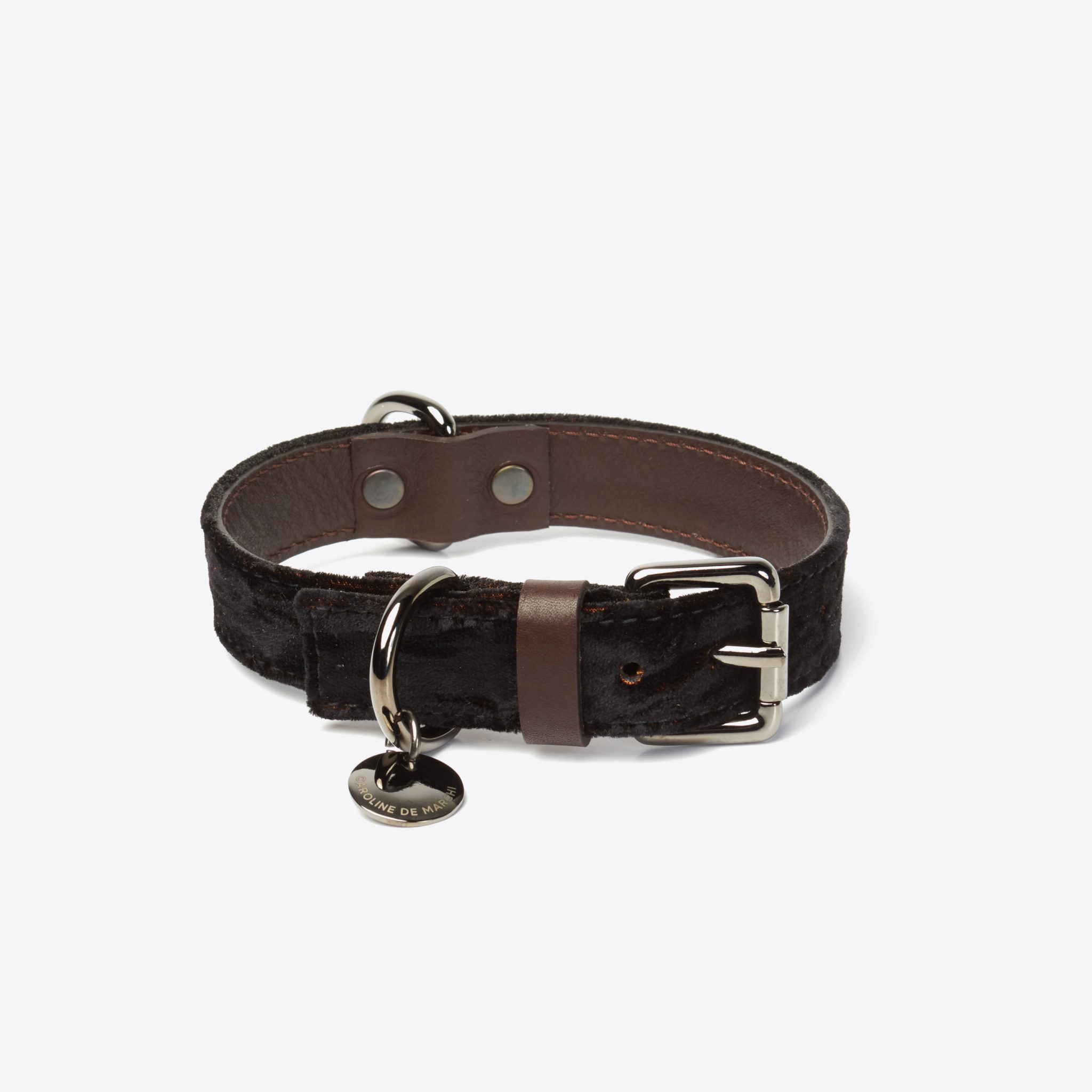 Toujours à la recherche de l’objet unique, hors mode et particulier, Caroline De Marchi propose la personnalisation de ses modèles, des initiales gravées sur les colliers et laisses aux bandoulières interchangeables, qu’elle peut varier et transformer selon ses humeurs.