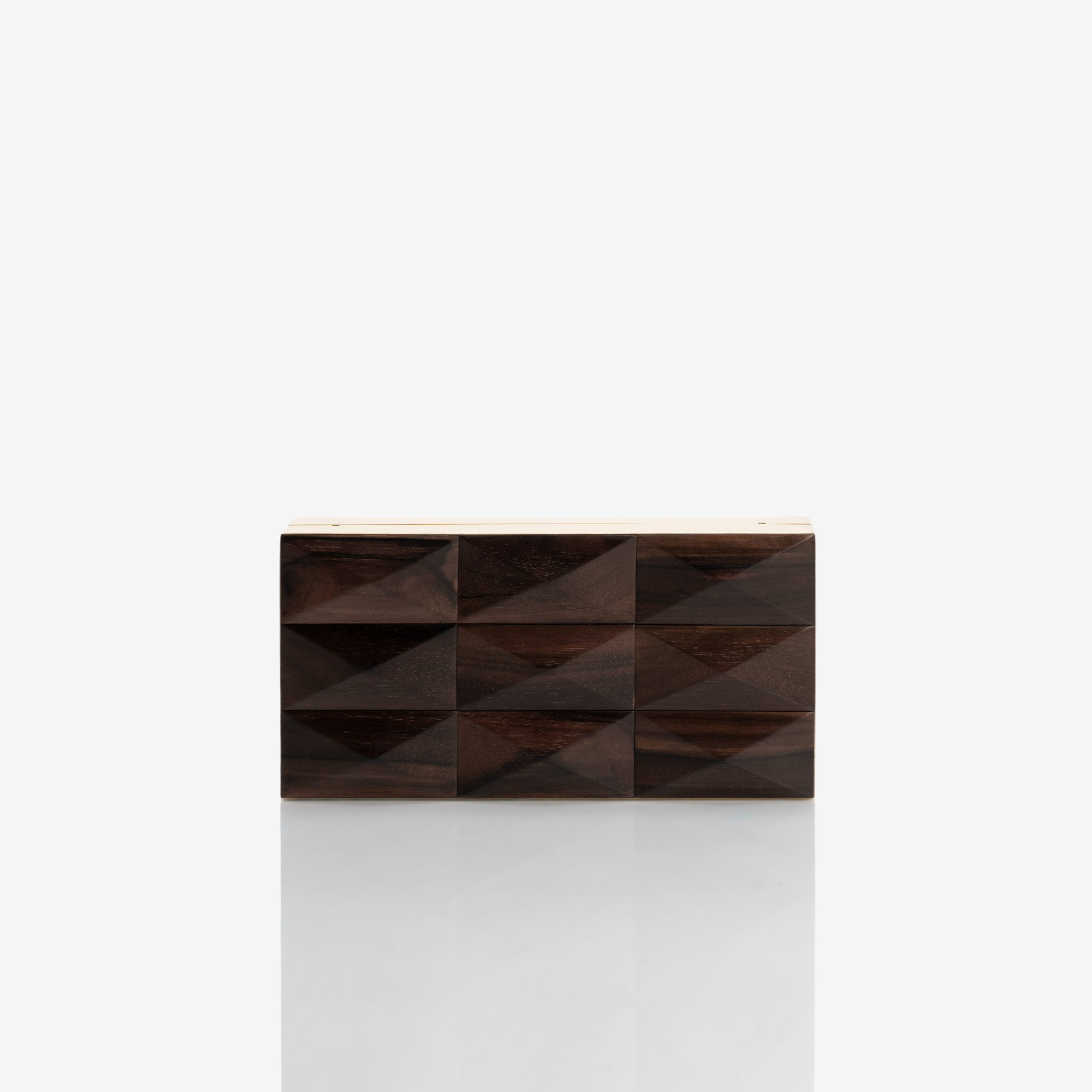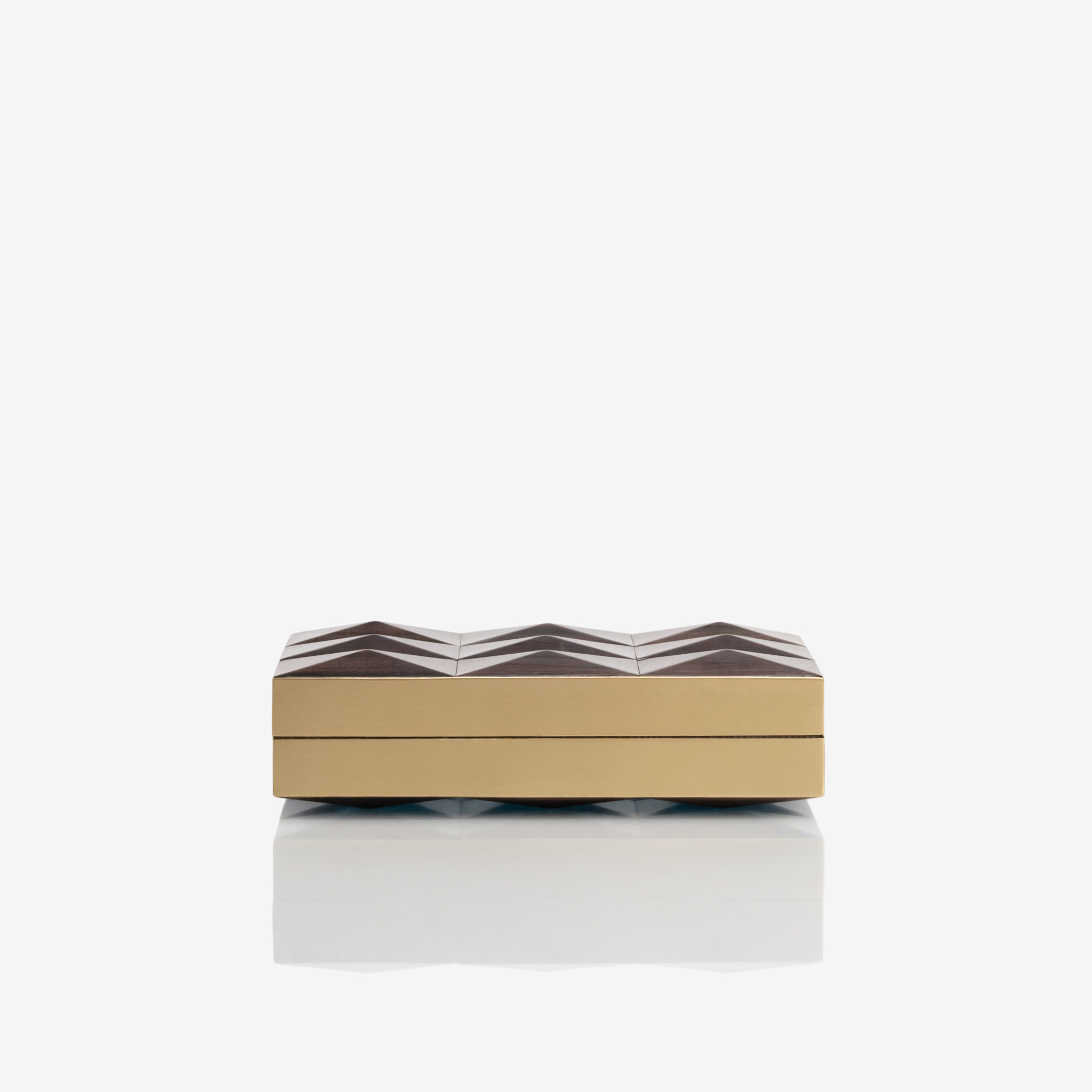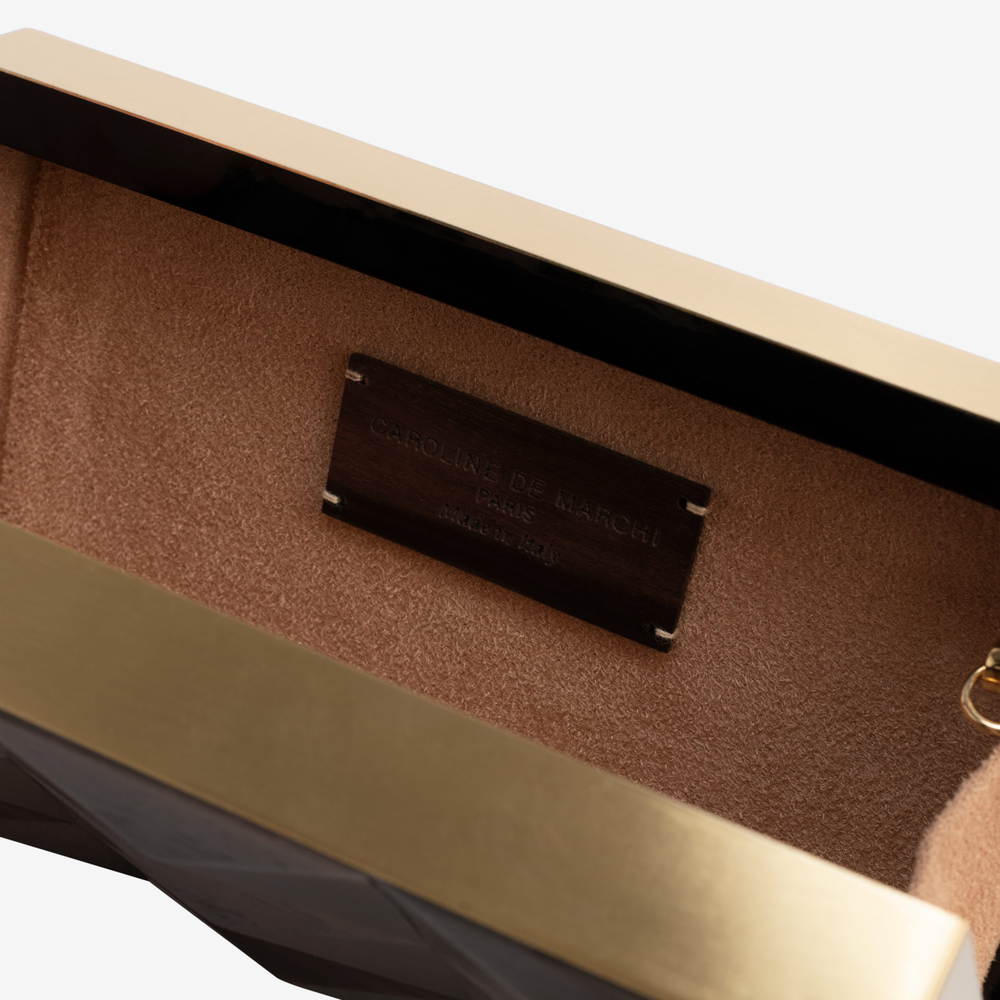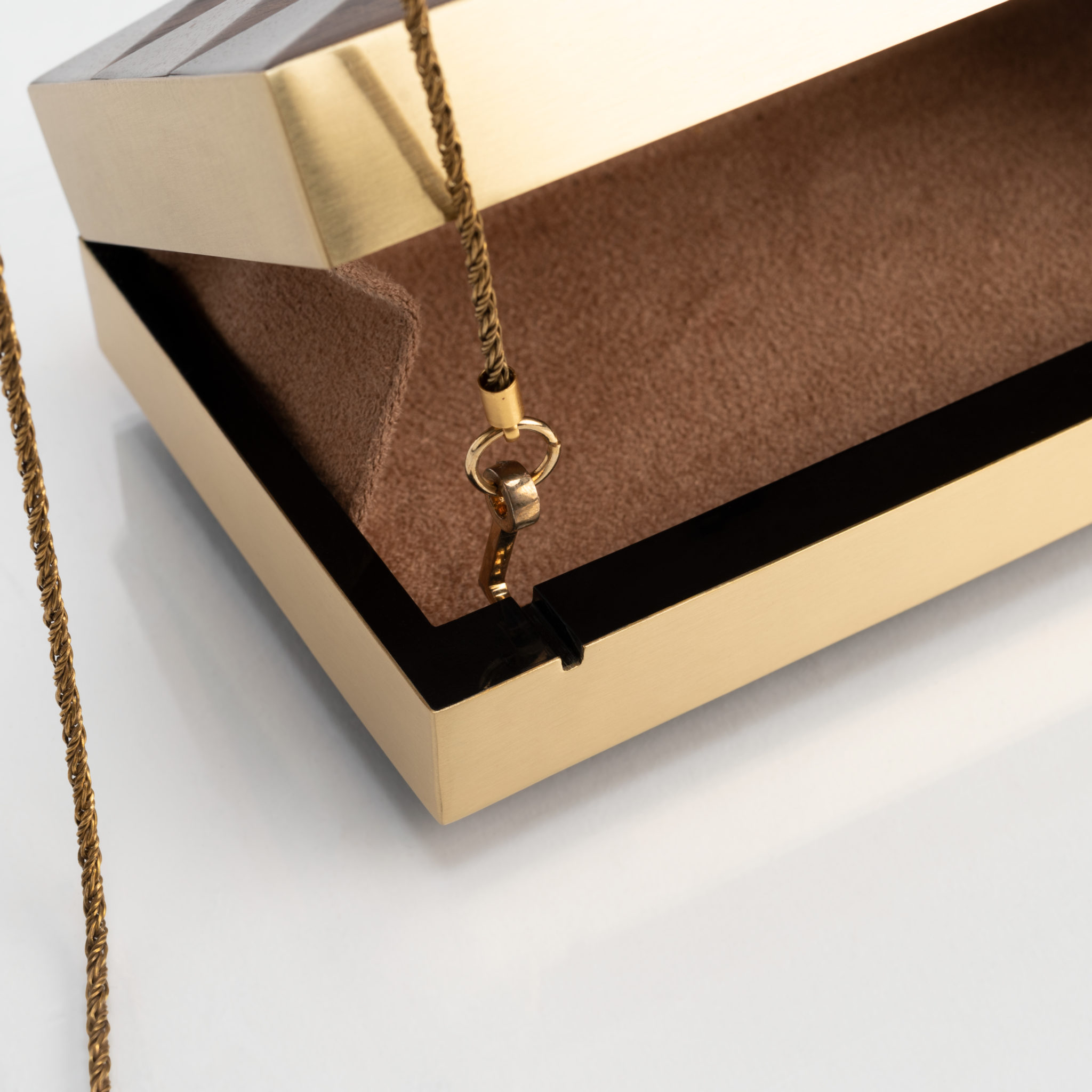Cette minaudière est confectionnée en bois d’acajou doublée de cuir. Elle est parée d'une chaine amovible en métal doré que l'on peut porter à l’épaule ou crossbody. Un modèle à la fois graphique et élégant qui habillera toutes vos tenues.
