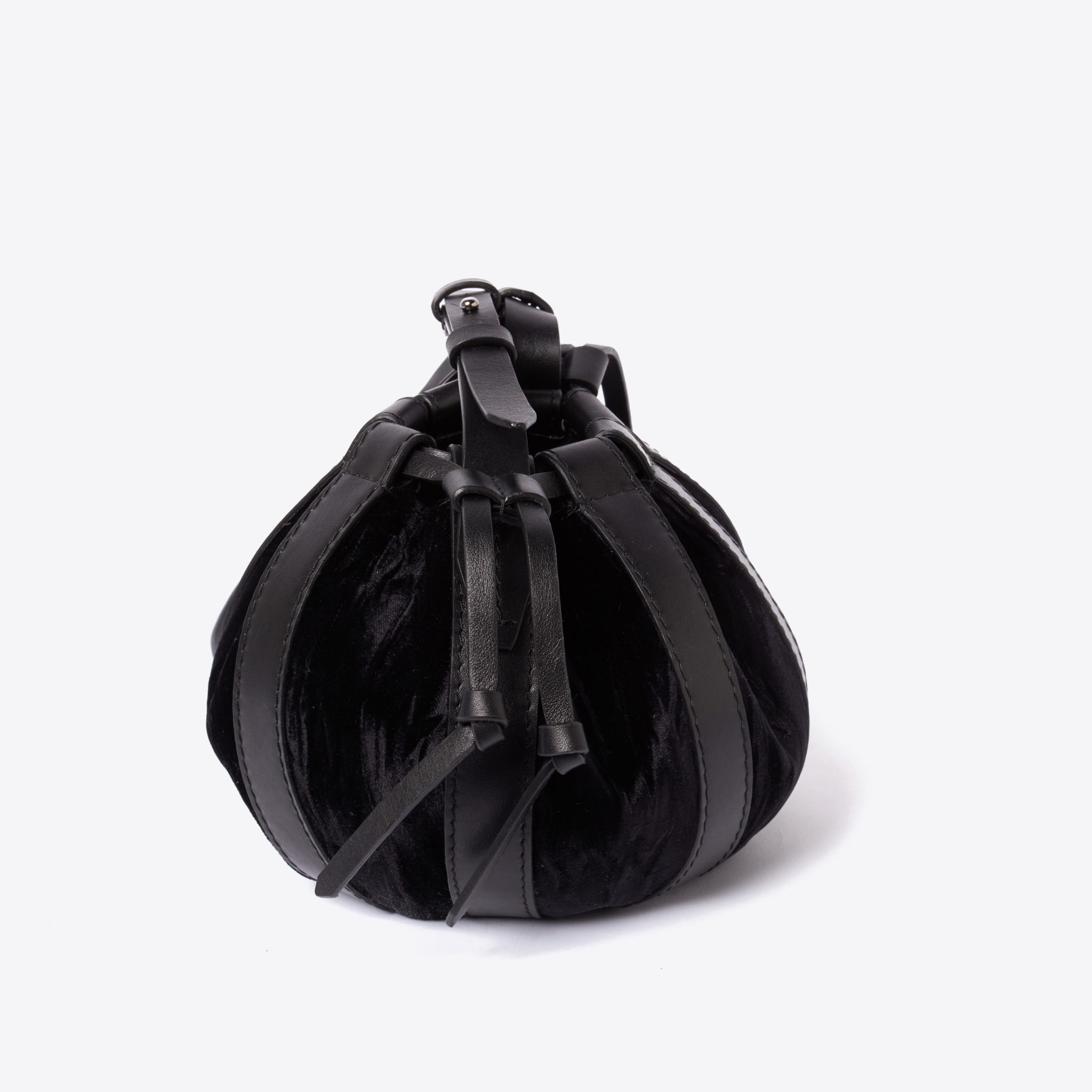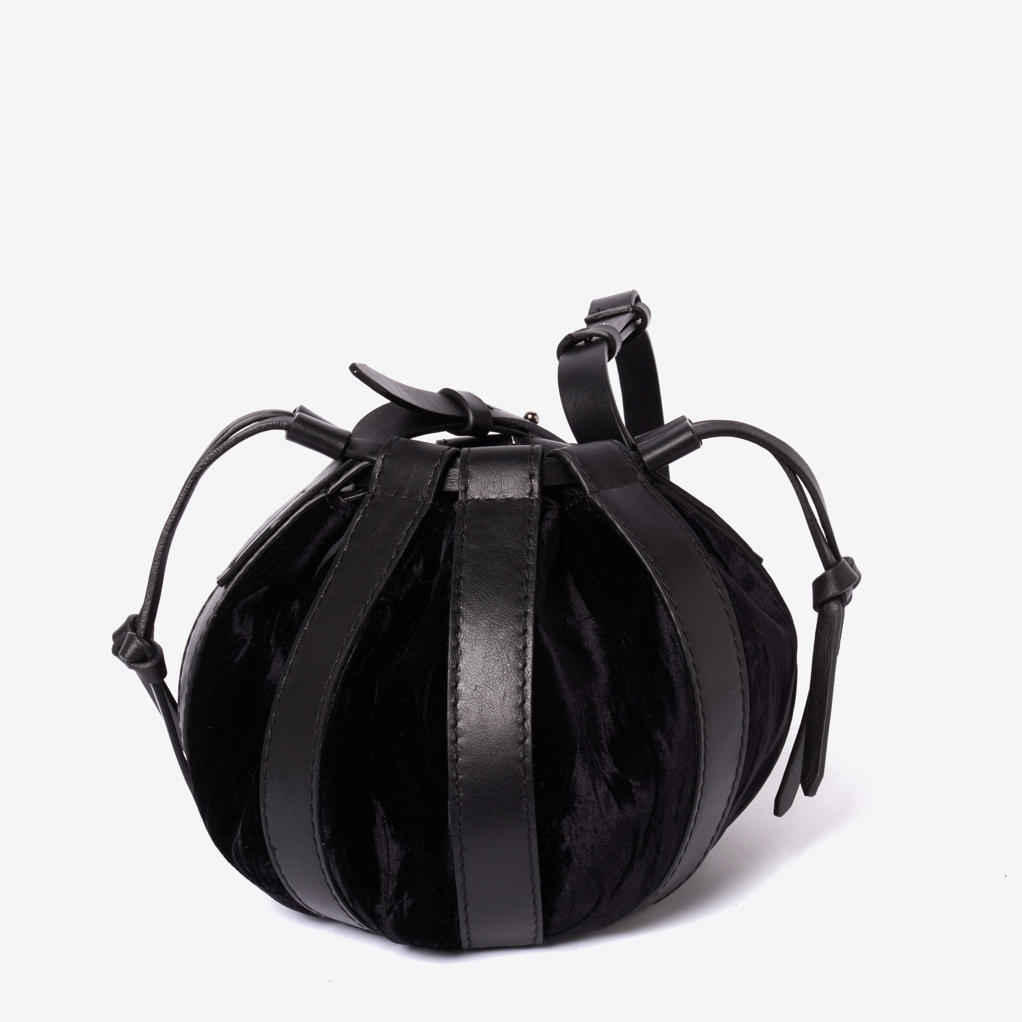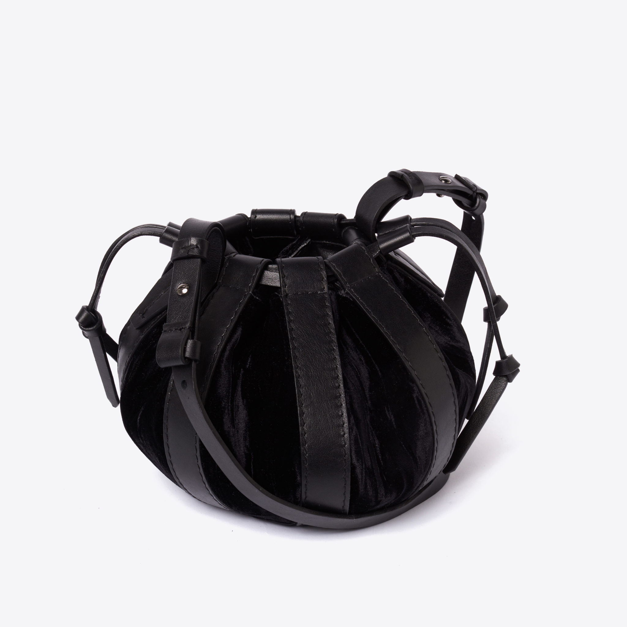 D’un noir intense et mystérieux, ce sac rond en velours frappé et cuir incarne une élégance moderne intemporelle. Doté d’une fine bandoulière en cuir assortie, il se portera à la main, à l’épaule ou crossbody selon les envies.