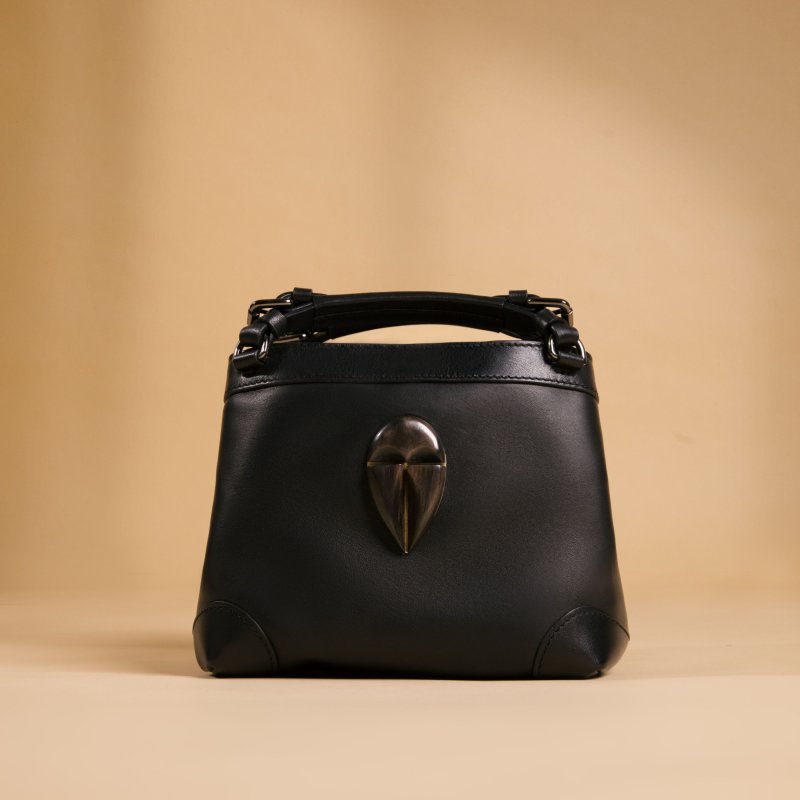 Ce mini sac élégant à l’allure singulière est confectionné dans un cuir nappa noir délicatement réhaussé par une petite empreinte en bois. Surpiqûres, boucles et finitions dorées lui apportent une touche de sophistication, idéale pour le soir.