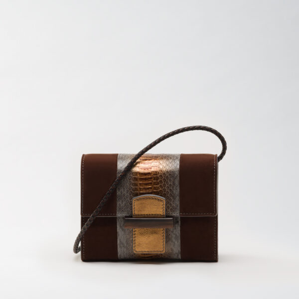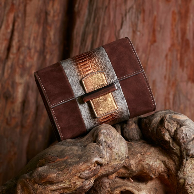 Mini sac à l’allure unique, le Reka Elentari propose un mariage original de matières et textures. Cuir de veau velours brun, cuir nappa gris et serpent d’eau gris et bronze s'associent avec goût. Les détails, fermoir en bois, languette en chevreau bronze et surpiqûres grises, apportent du caractère à ce must-have mode.